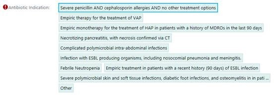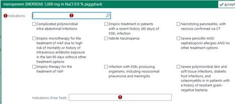 To make it more obvious which antibiotics are restricted to only certain indications, the indications field at the top will be made blank, and the approved indications will be shown as buttons in the body of the order (see pictures below). This knowledge can help you prevent a page from pharmacy asking you to choose an alternative antibiotic because the indication chosen isn’t among the approved indications.