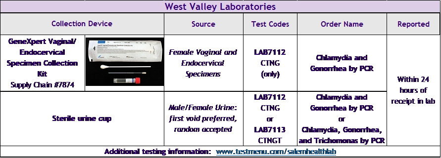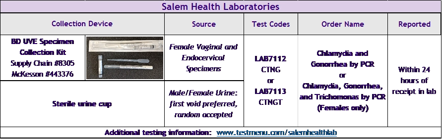 Effective Aug. 17, 2021, Salem Health Laboratories will be changing swab collection devices for chlamydia and gonorrhea testing due to new instrumentation, and will be updating ordering for a streamlined process and to reduce confusion. An educational video on collection instructions for the new kit can be found at moleculardiagnostics.bd.com/resource-center/ctgctv-collection-procedure.