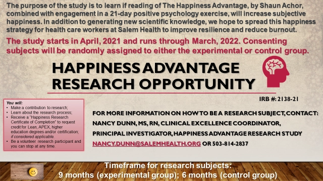 We are inviting employed or contract providers to participate in a new research study being conducted at Salem Health. Research is crucial in advancing knowledge of health care worker happiness. Numerous scientific studies in positive psychology have demonstrated that targeted positive psychology interventions can result in meaningful changes in a healthcare worker’s subjective happiness. This is an experimental design with randomized experimental and control groups. Maximum number of study subjects 100 in each group. Launches April 2021 and concludes March, 2022. Must be an employed or contract provider to be eligible. Independent providers are not eligible as the investigators are measuring health care workers’ subjective happiness as it relates to one primary work place setting, Salem Health. Contact the Principal Investigator, Nancy Dunn MS, RN, Clinical Excellence Coordinator at nancy.dunn@salemhealth.org or 503-814-2837 for more information.
