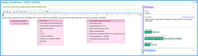 A SmartPhrase for sepsis goes live on Wednesday, March 27.It can be found by two headings: SepsisAProviderNote or Hospsepsis. Either of these will pull up the following smart phrase (see screenshot below).