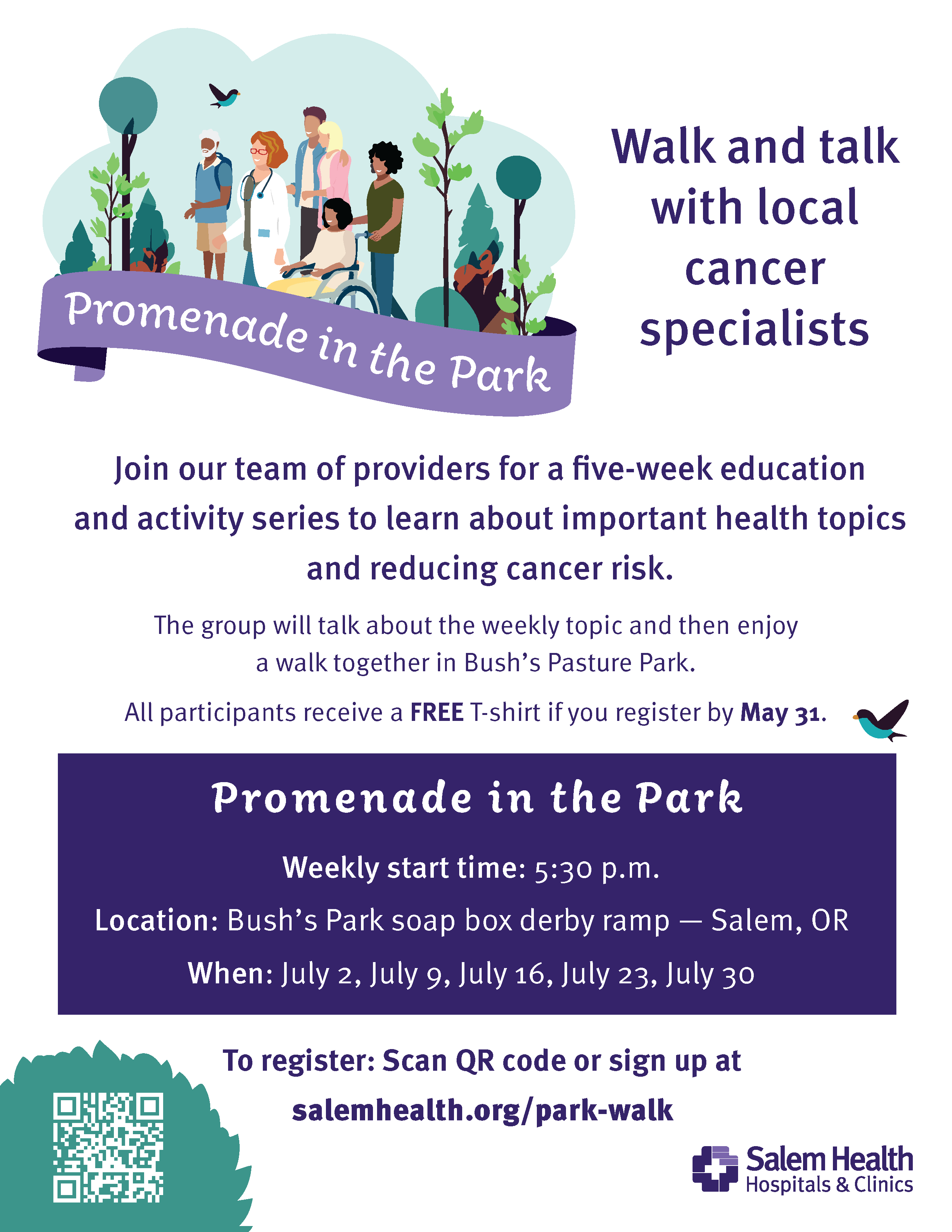 Looking to boost health and knowledge? Share this unique opportunity with your staff and patients — Join Salem Health Cancer Center for Promenade in the Park!