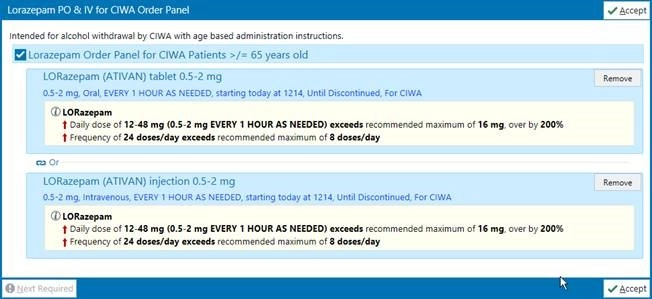 Starting March 2, the lorazepam orders in the “Adult Alcohol Withdrawal” order set will display the pair of lorazepam orders that is appropriate based on the age of the patient. If you have any questions regarding the following screenshots, contact Matt Tanner in Pharmacy (503-814-2048 or matthew.tanner@salemhealth.org).