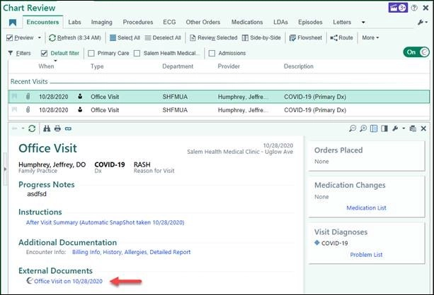 Previously, this was reported manually. Now it is automatic and visible in Epic. The electronic report document will be accessible in Chart Review by single clicking the associated appointment and clicking the link under External Documents. Here are screen shots of the Chart Review.